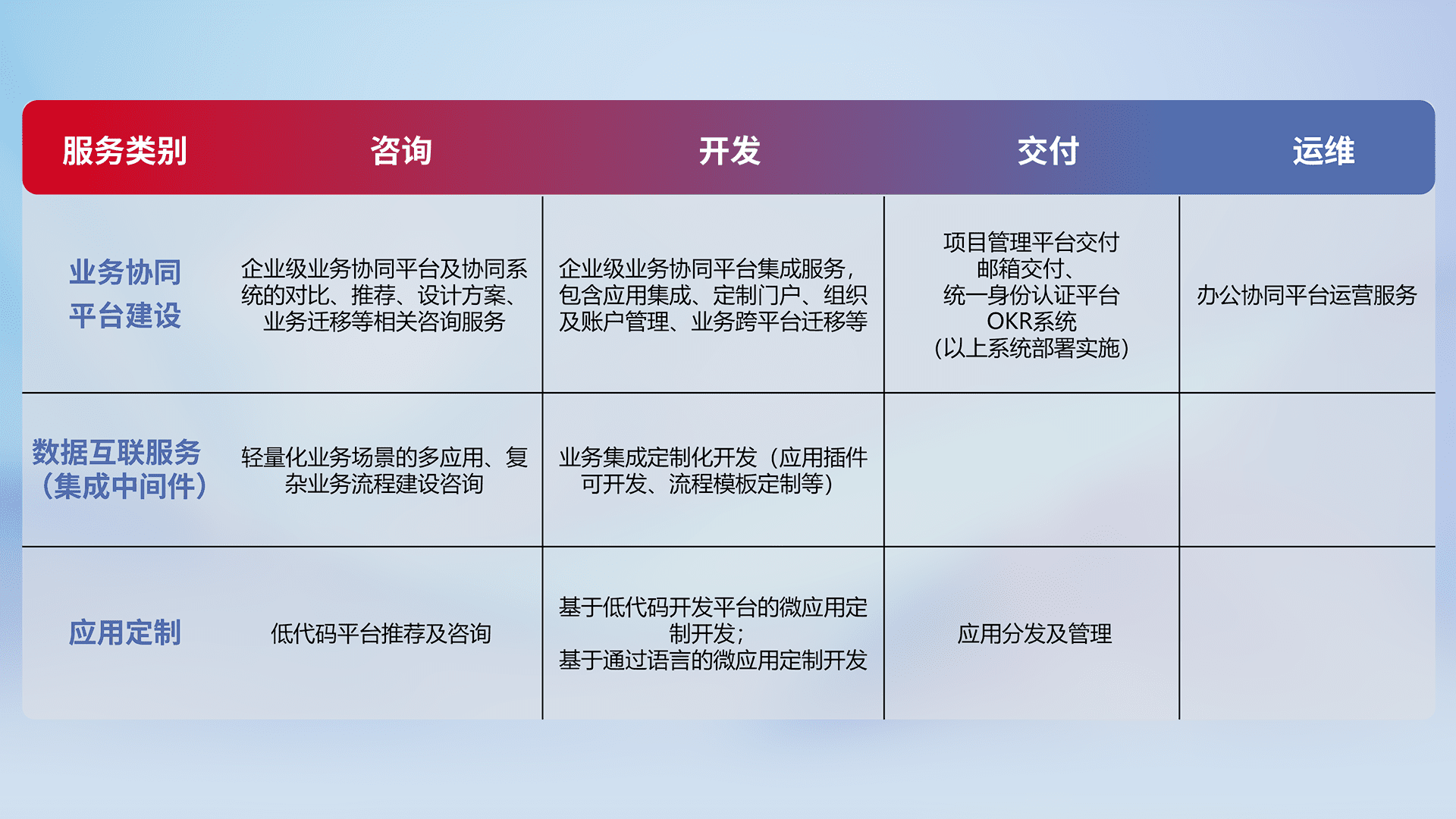 针对钉钉、、、企微、、、IDaas等平台级产品提供产品的规划、、、方案、、交付、、、定制化开发等服务,,,,实现如统一协同办公、、、智能客户服务、、、、混合会议管理、、智能数据查询、、等业务场景,,,,实现数字化转型。。